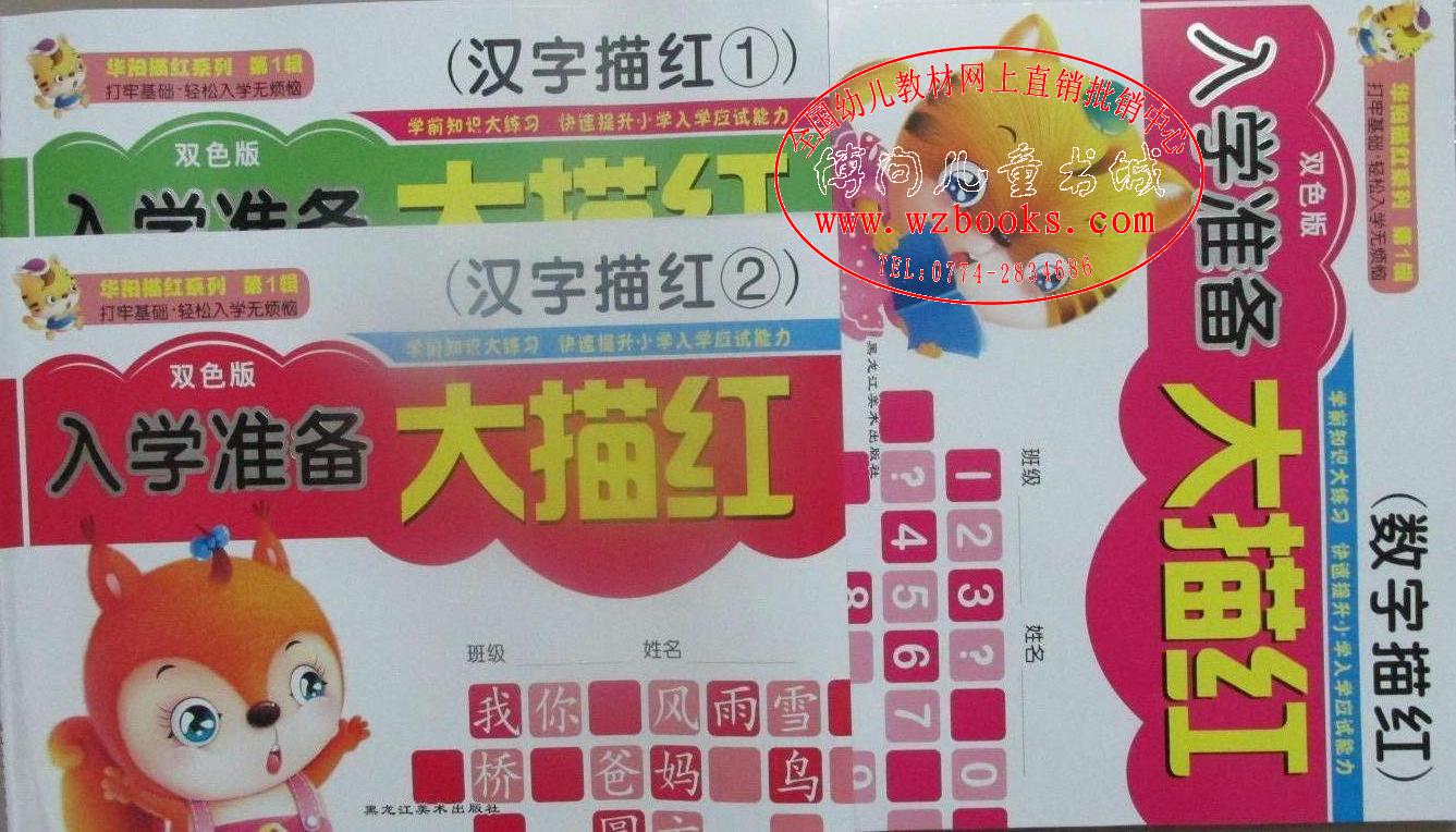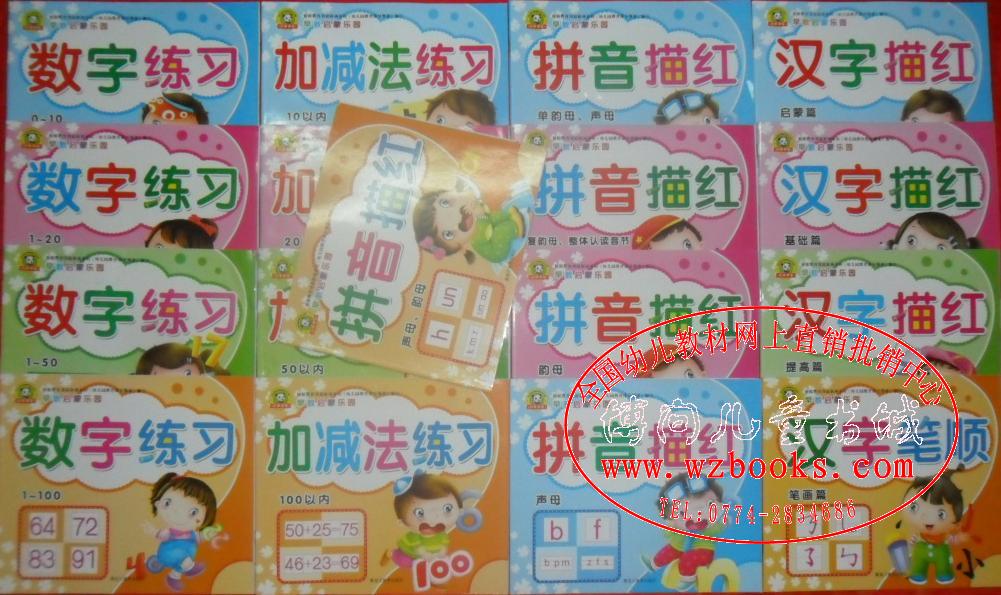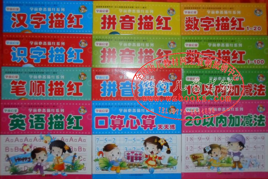 幼儿园常用教材-描红类:晨阳早教彩色规范描红24开本(单本定价10元)全套16本: 5、10、20、50、100以内加减法; 0-10、1-20、1-50、1-100数字描红; 笔顺描红、汉字描红(启蒙)、汉字描红(基础)、汉字描红(提高); 拼音描红(单韵母声母)、拼音描红(复韵母)、拼音描红(声母韵母)/英子幼教亲子早教潜能开发畅销版描红共分15本:数字练习1-10、1-20、1-50、1-100,加减法练习1-10、1-20、1-50,拼音描红声母、韵母、声韵,汉字描红1、2、3、4、5 每本定价5元,24开46页/学前保护视力描红本(16开39页)