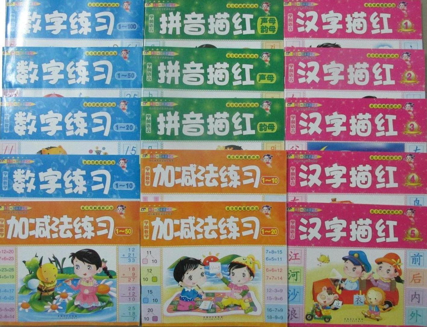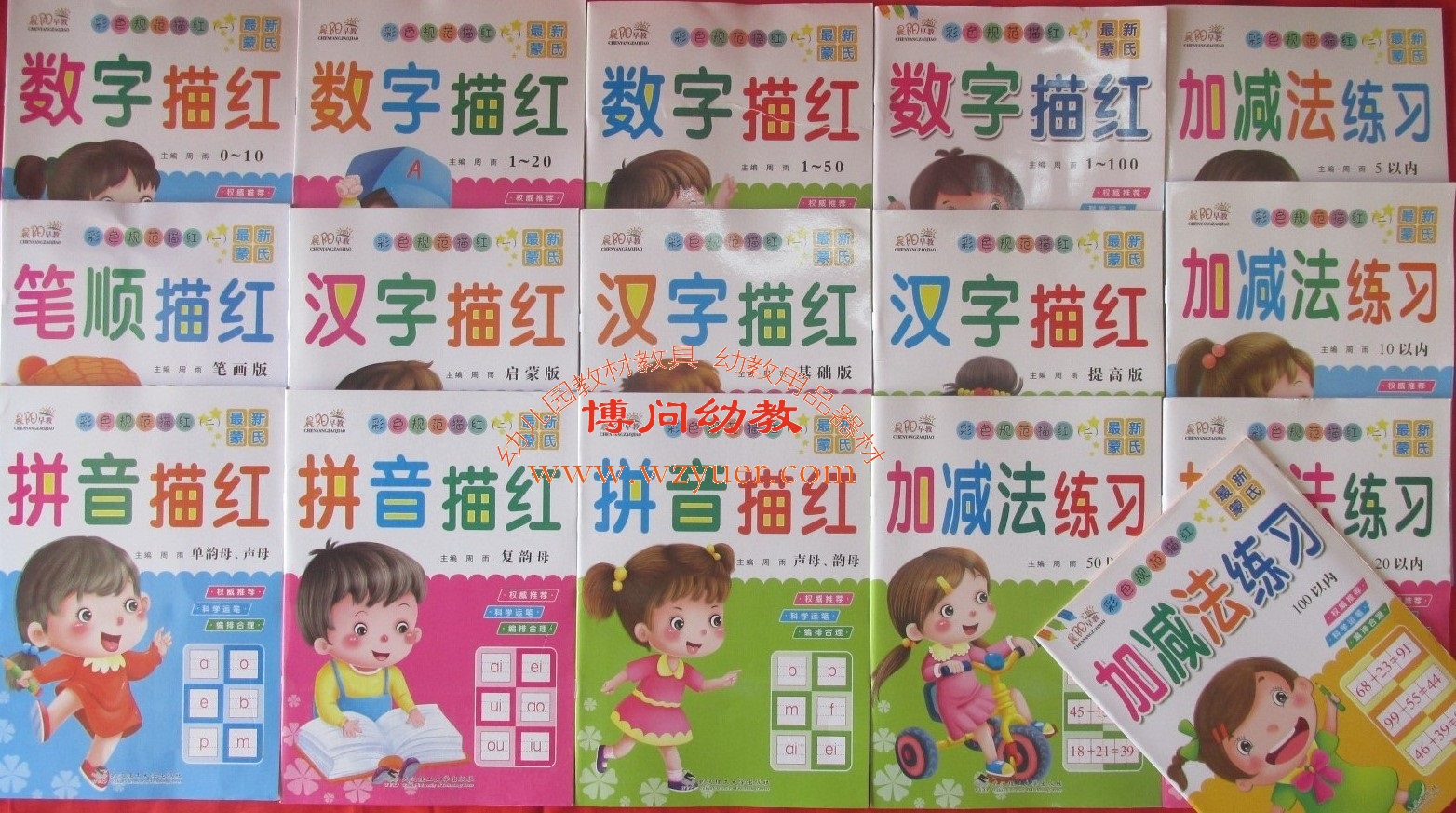 晨阳早教彩色规范描红16开(单本定价10元)全套16本: 5、10、20、50、100以内加减法; 0-10、1-20、1-50、1-100数字描红; 笔顺描红、汉字描红(启蒙)、汉字描红(基础)、汉字描红(提高); 拼音描红(单韵母声母)、拼音描红(复韵母)、拼音描红(声母韵母)